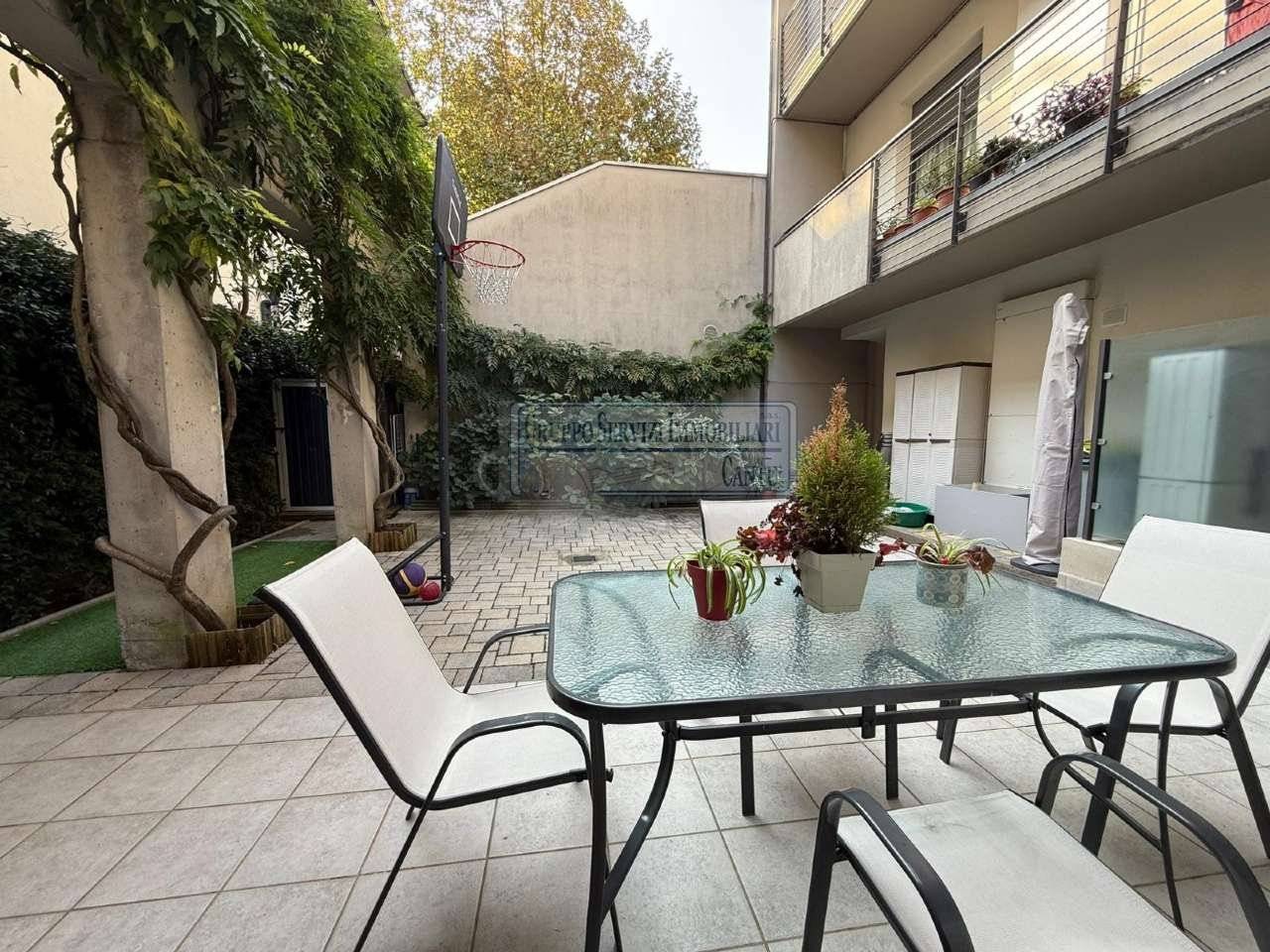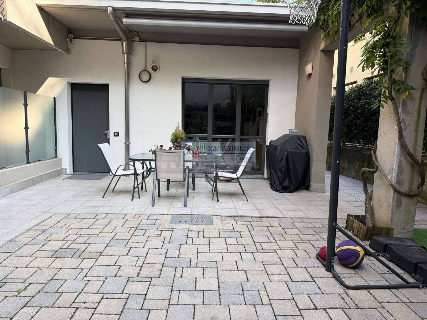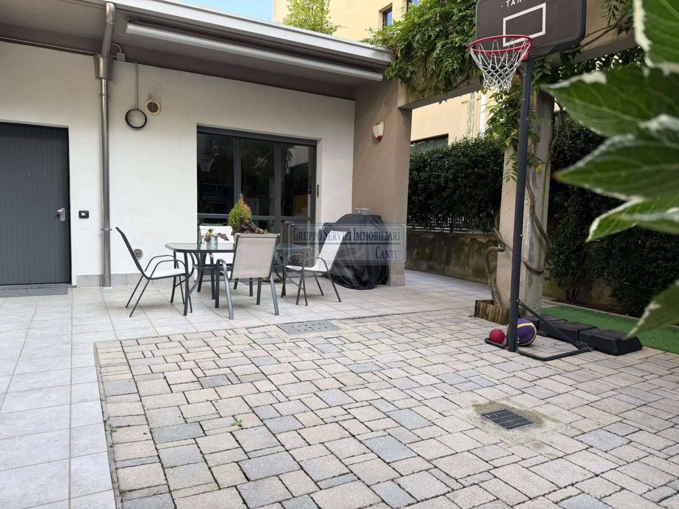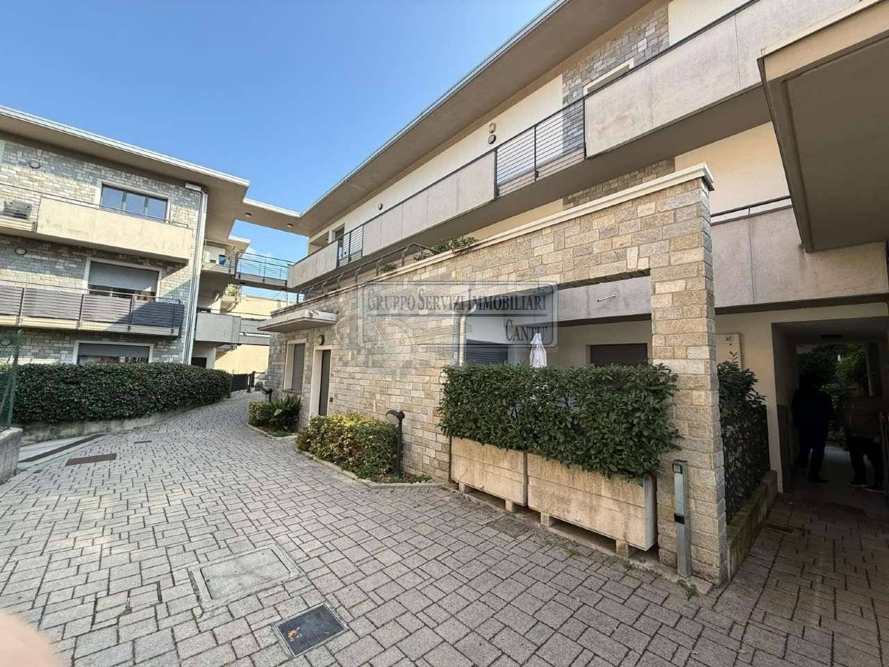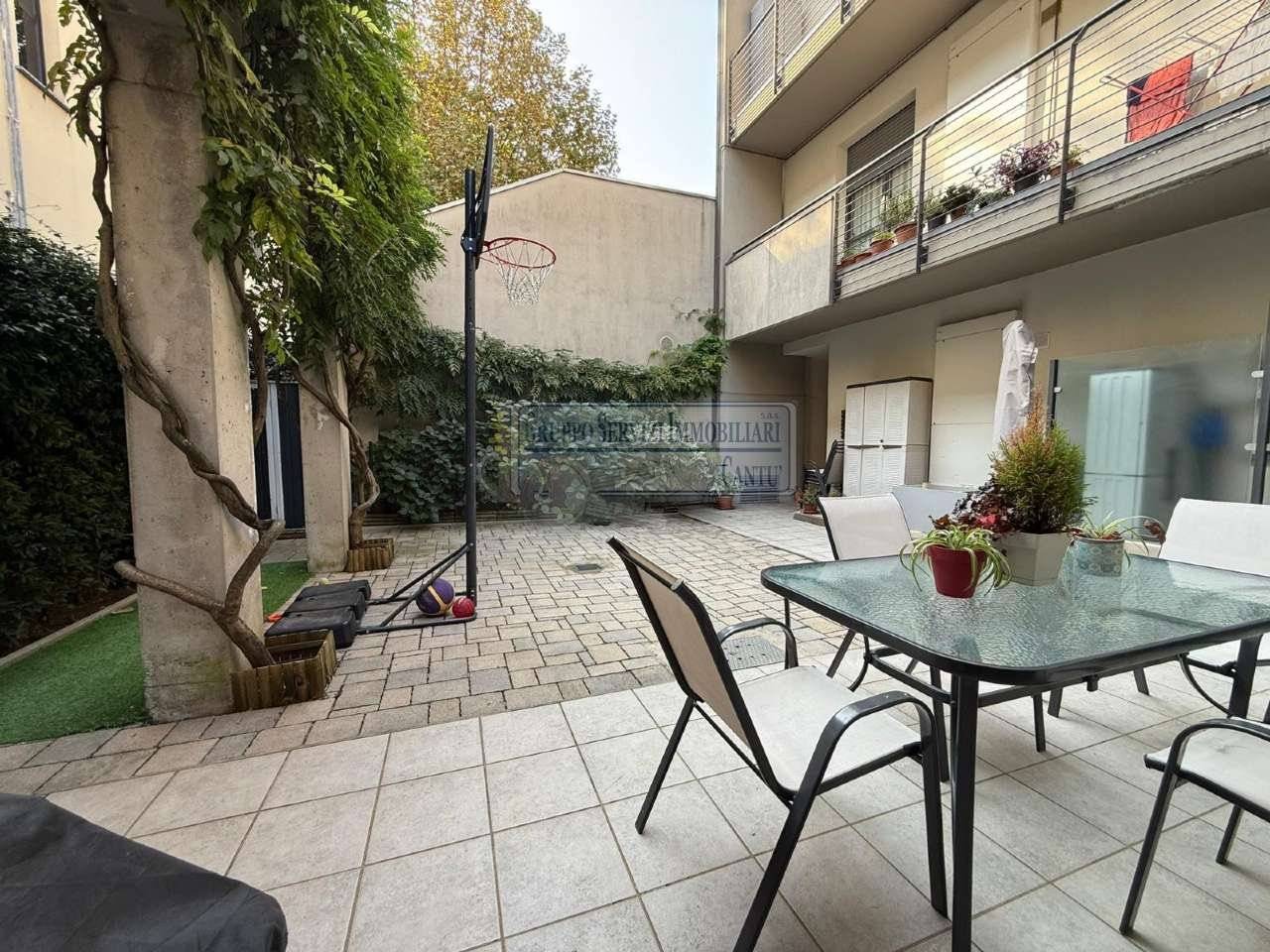 Nella centralissima viale Madonna, l'unica via alberata in Cantù, dove si trovano tutti i capolinea dei bus con direzione Mariano, Monza e Como, di fronte all'asilo nido, alle scuole primarie e secondarie ed al liceo, in una piccola e recentissima palazzina Edificata in Classe B, introvabile soluzione a piano terreno con ingresso indipendente di 4 locali doppi servizi con oltre 80 m² di area esterna cintata in proprietà, nata come giardino, oggi interamente pavimentata a terrazzo. Riscaldamento a pavimento, autonomo con caldaia a condensazione collegata ad un impianto privato di pannelli solari per la produzione di acqua calda sanitaria. Libera sui tre lati con serramenti in legno a vetrocamera e tapparelle motorizzate, con ventilazione meccanica puntuale nella zona giorno, e l'intero appartamento climatizzato con un impianto canalizzato. L'accesso si ha dal cancelletto privato e da un corridoio coperto che ci proietta subito sull'intera area in proprietà dove trova spazio sia il tavolo esterno e l'angolo BBQ, per il papà e la mamma, sia il canestro per i ragazzi. La zona giorno è interamente esposta a sud con una ampia vetrata che ci collega al terrazzo esterno, dove troviamo subito la zona tavolo BBQ protetta da una tenda motorizzata. Disimpegnata una prima zona notte composta da una camera allestita con un lettone ad una piazza e mezza ed un bagno padronale con vasca. Perfettamente disimpegnata una seconda zona notte dove troviamo due camere ed un bagno, anch'esso finestrato e allestito con doccia e lavanderia. Questa soluzione è priva di barriere architettoniche. Possibilità di abbinare una box doppio al prezzo aggiuntivo di Eu.. 25.000.